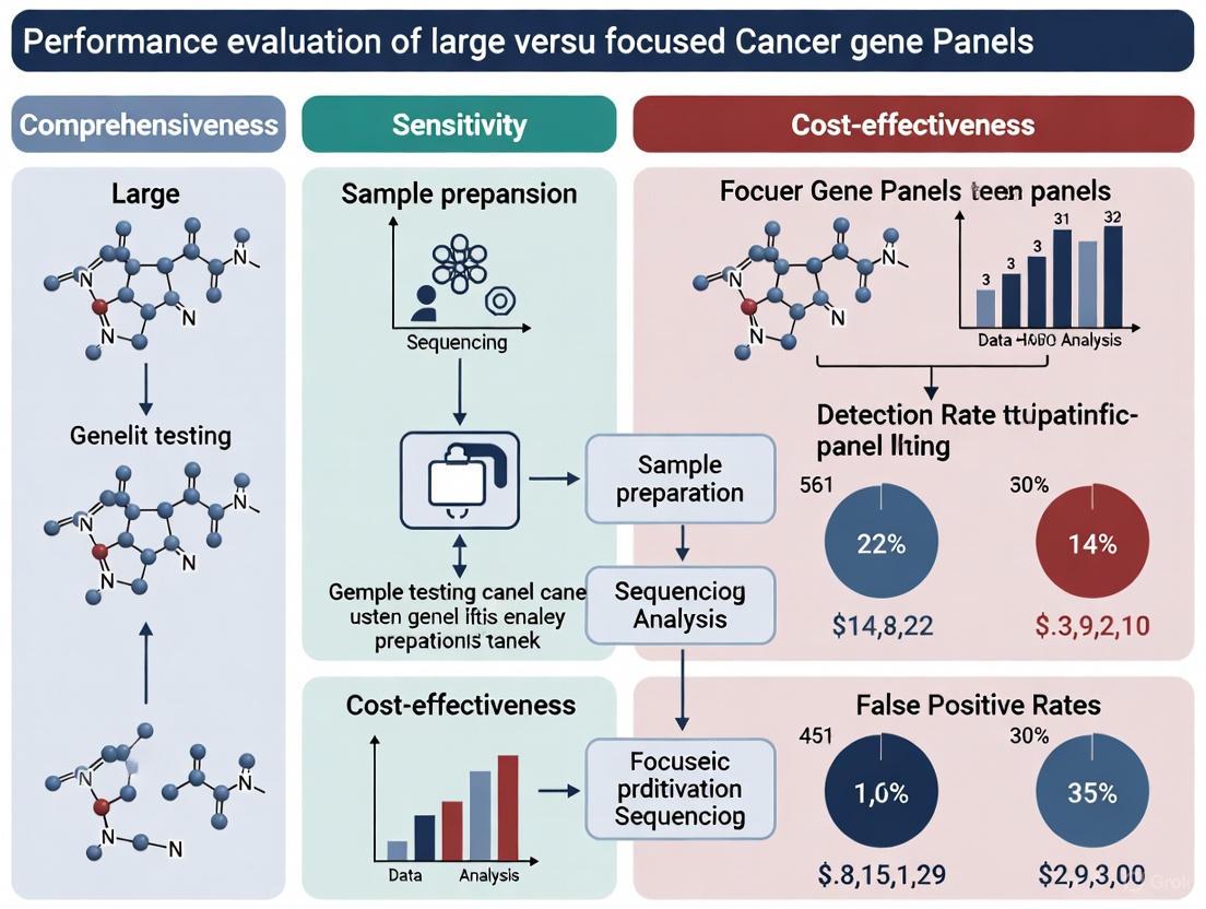 This article provides a comprehensive performance evaluation of large (comprehensive) versus focused (limited) gene panels in oncology next-generation sequencing. Aimed at researchers, scientists, and drug development professionals, it explores the foundational principles, methodological workflows, and common challenges of both approaches. It synthesizes recent comparative data and validation studies, including metrics on diagnostic yield, turnaround time, cost-effectiveness, and clinical actionability. The content is structured to inform strategic decision-making for assay selection in both research settings and clinical trial design, addressing the critical trade-offs between breadth of genomic interrogation and practical implementation.