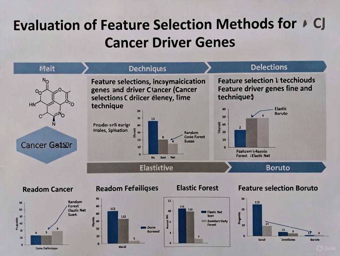 The accurate identification of cancer driver genes is a cornerstone of modern oncology, essential for understanding carcinogenesis, developing targeted therapies, and advancing personalized medicine. As high-throughput technologies generate increasingly complex multi-omics datasets, feature selection methods have become critical computational tools for distinguishing driver mutations from passenger mutations in cancer genomics. This review synthesizes findings from recent benchmark studies to evaluate the performance of various feature selection methodologies and provides evidence-based recommendations for researchers investigating cancer driver genes. We examine methodological approaches across diverse computational frameworks, assess their performance using standardized metrics, and outline optimal practices for experimental design in driver gene identification.