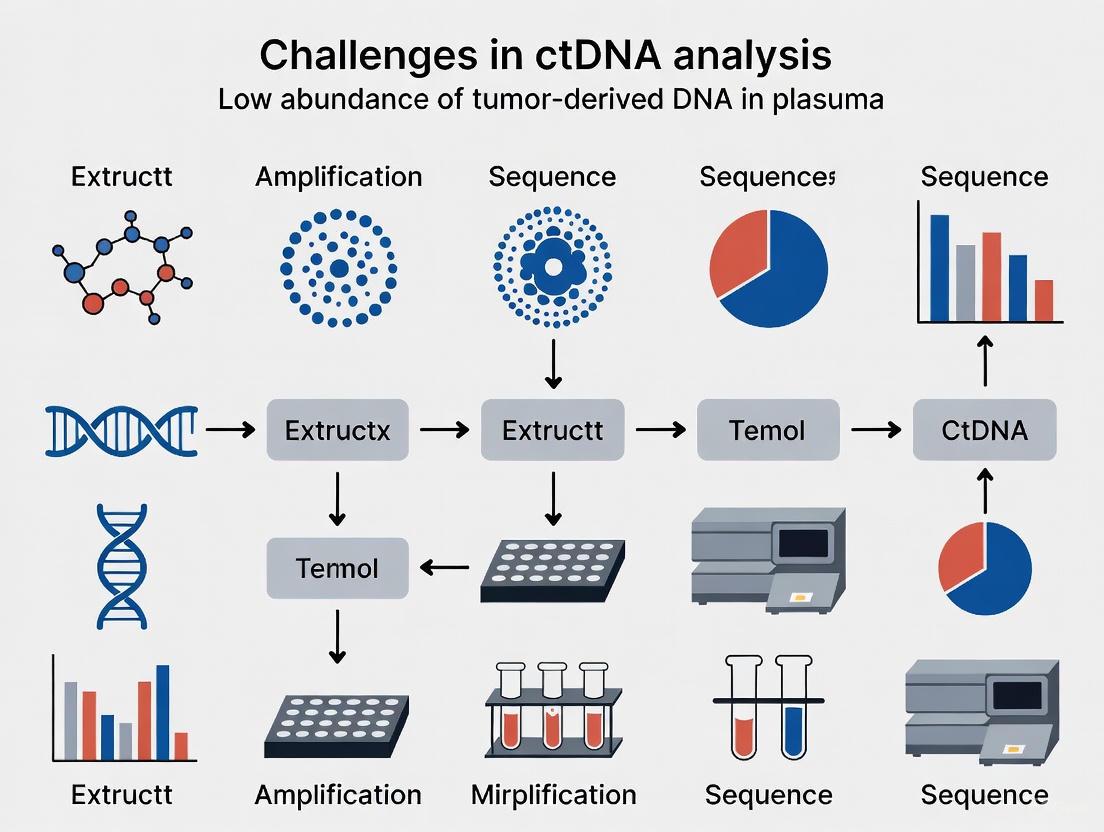 This challenge is intrinsically linked to the fundamental issue of low ctDNA abundance in the bloodstream. Circulating tumor DNA typically represents only a small fraction of total cell-free DNA, often less than 1% in early-stage disease or low-shedding tumors, against a large background of normal cell-free DNA [3] [23]. The absolute quantity of mutant DNA molecules available for analysis can be astonishingly low; for instance, a 10 mL blood draw from a lung cancer patient might yield only approximately 8,000 haploid genome equivalents. With a ctDNA fraction of 0.1%, this provides a mere eight mutant DNA fragments for the entire analysis, making detection statistically improbable with conventional assays [3]. This limitation is particularly problematic for tumors with inherently low ctDNA shedding, such as some lung cancers, which exhibit mean plasma levels of 5.23 ± 6.4 ng/mL compared to high-shedding tumors like liver cancer (46.0 ± 35.6 ng/mL) [3].