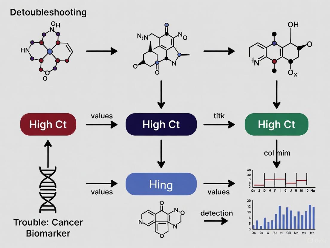 Effectively troubleshooting high Ct values is paramount for unlocking the full potential of cancer biomarkers in precision medicine. A systematic approach that integrates a deep understanding of biomarker biology, adopts advanced sensitive methodologies like dPCR and NGS, implements rigorous troubleshooting protocols, and adheres to robust statistical validation frameworks is essential. Future directions will be shaped by the integration of multi-omics data, the application of AI for pattern recognition in complex datasets, and the development of standardized, scalable workflows. By addressing these challenges, researchers can enhance the reliability of biomarker detection, accelerating the development of non-invasive tools for early cancer diagnosis, personalized treatment selection, and improved patient outcomes.